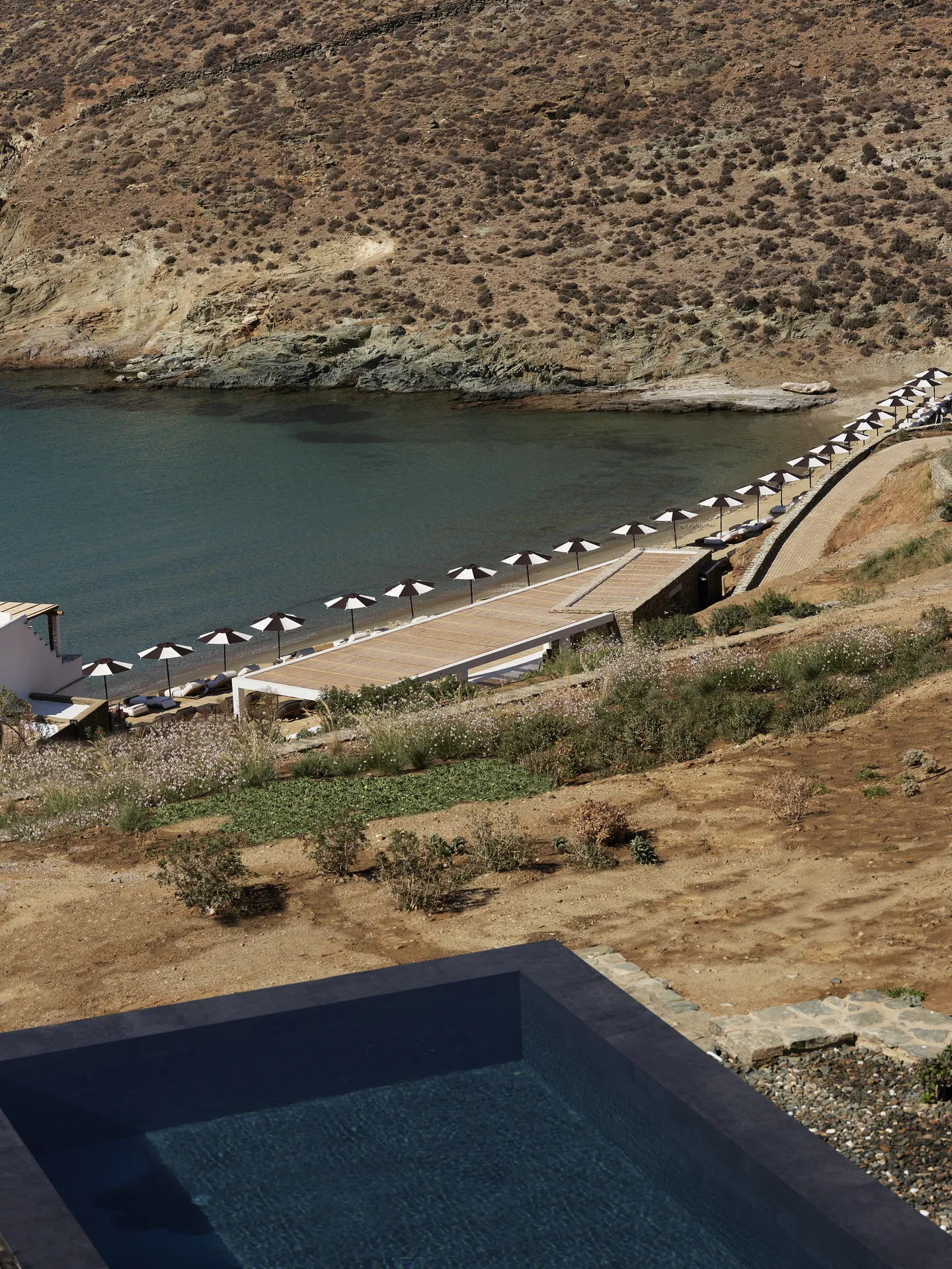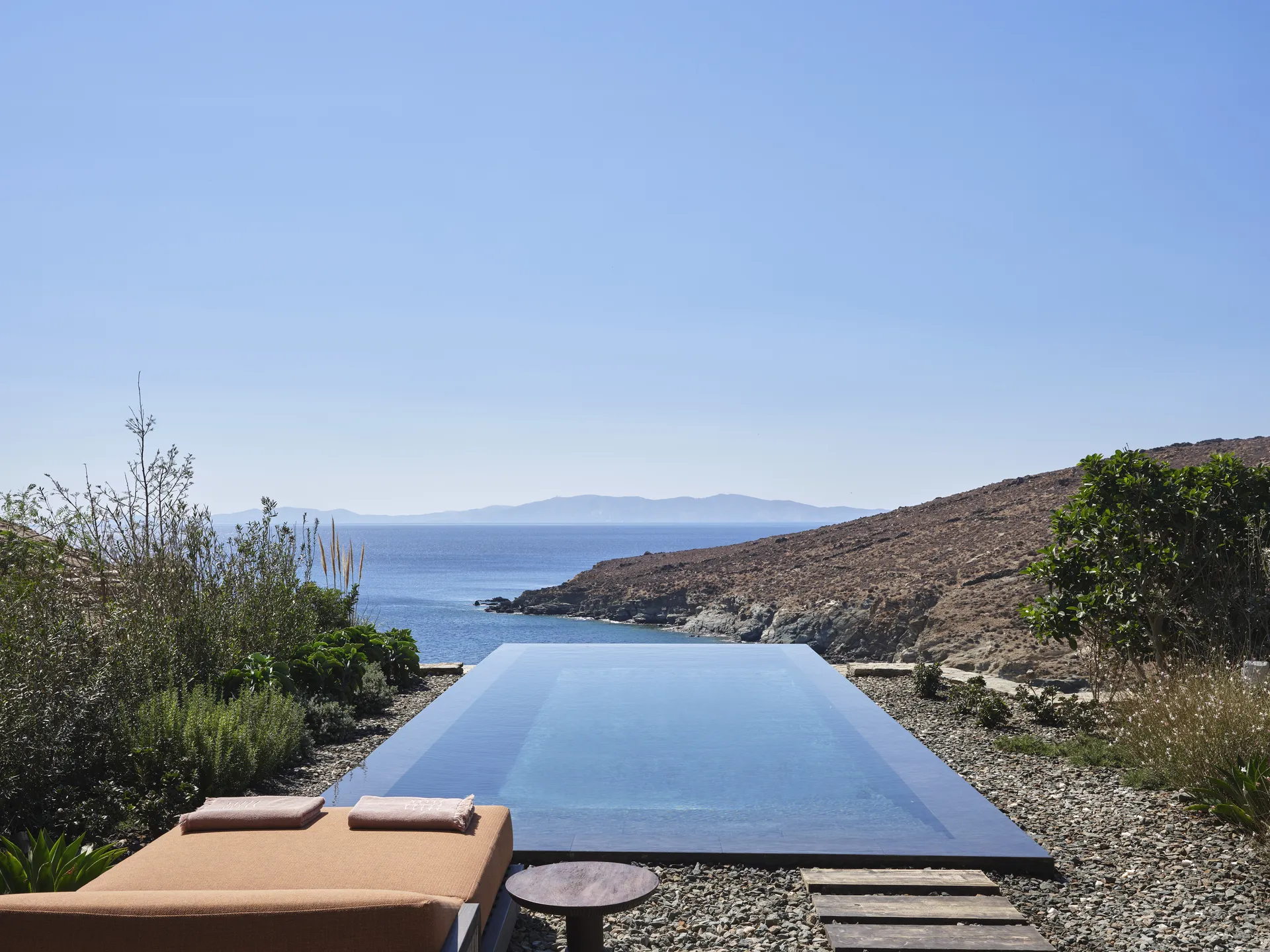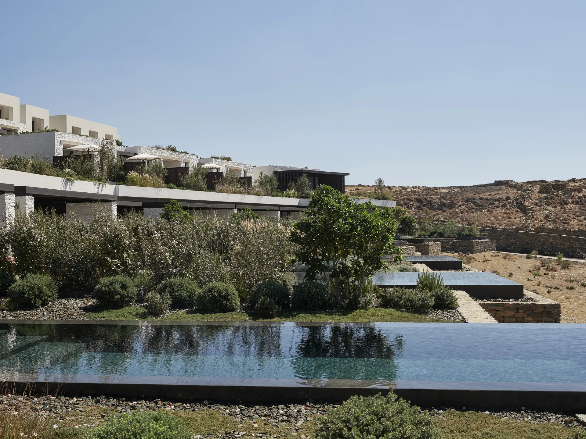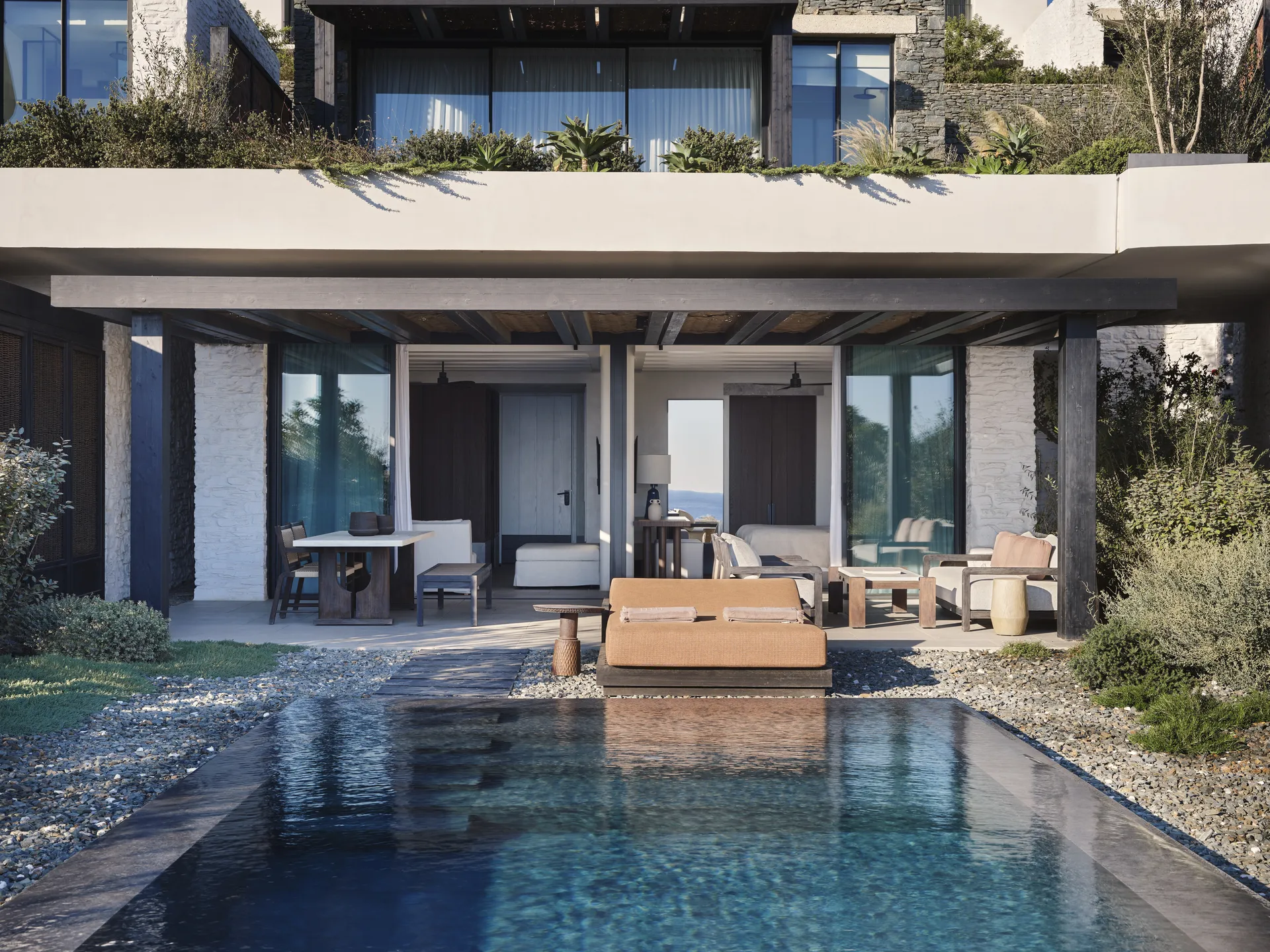 Of the 77 rooms and suites, 54 include private or shared pools. Terraces blur the line between indoors and out. The main infinity pool is etched into the landscape, appearing more like a natural formation than a design feature.