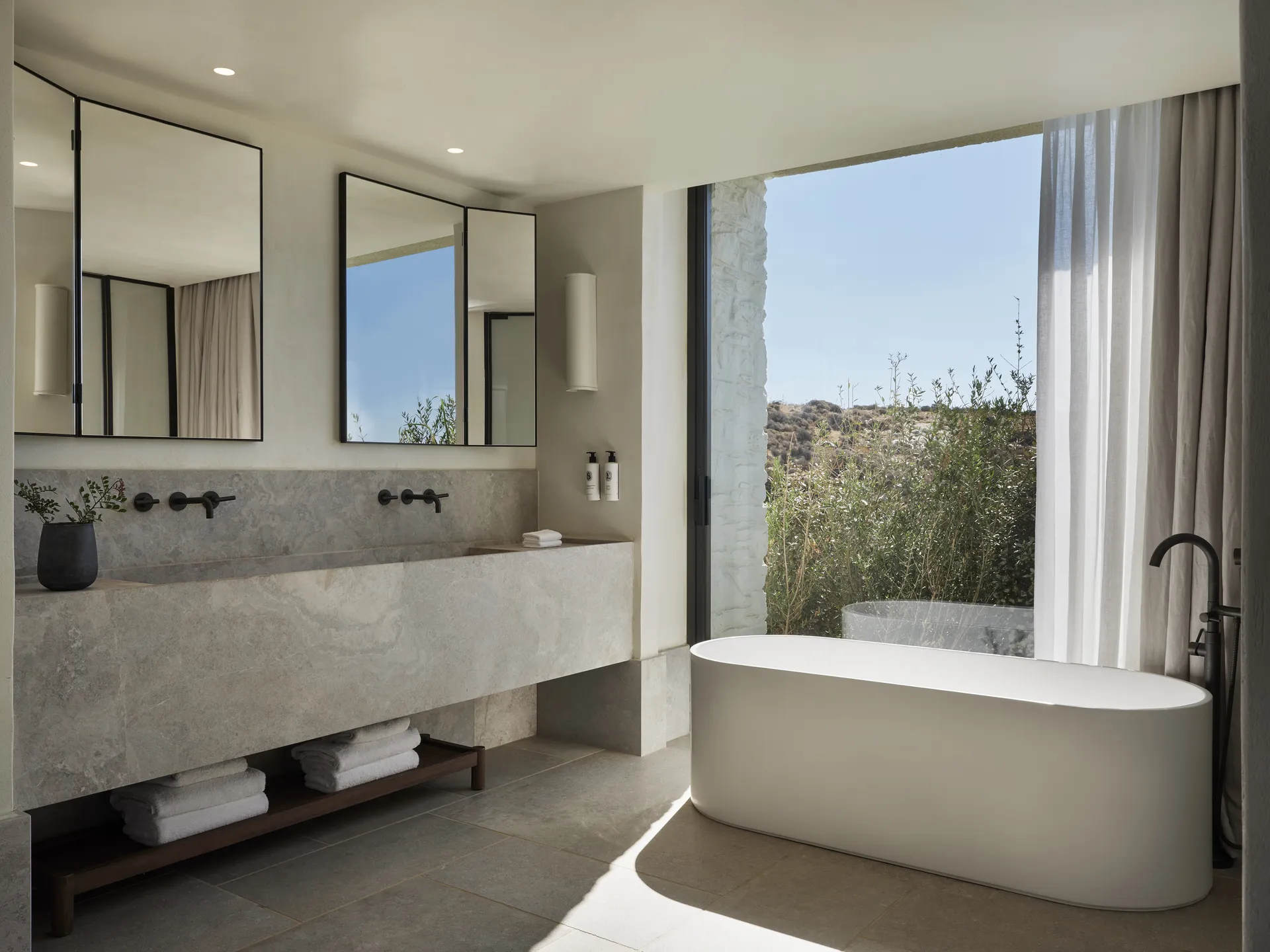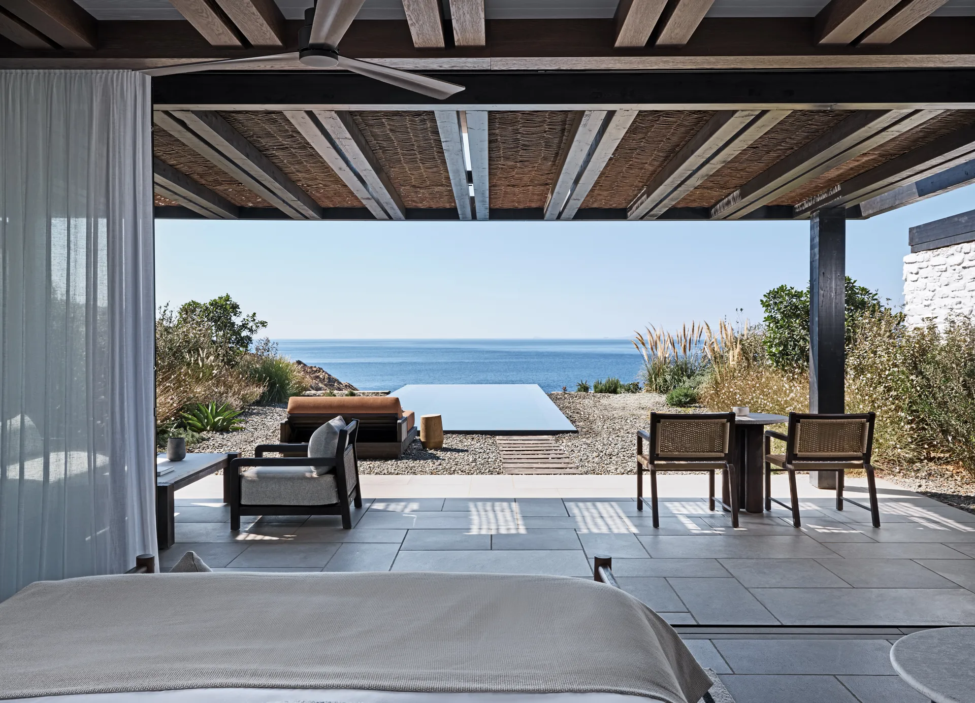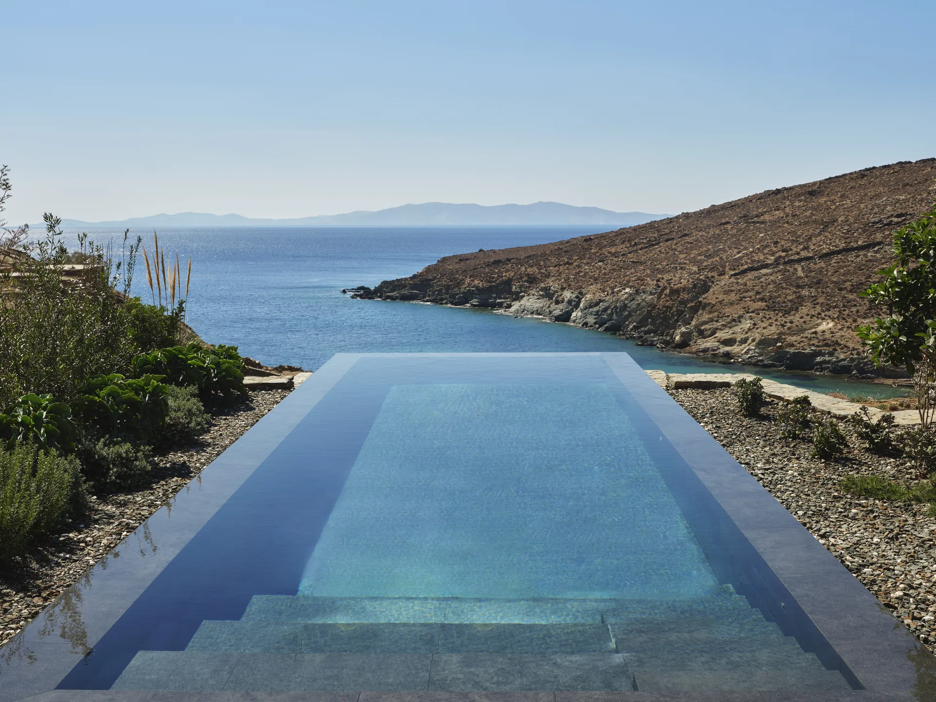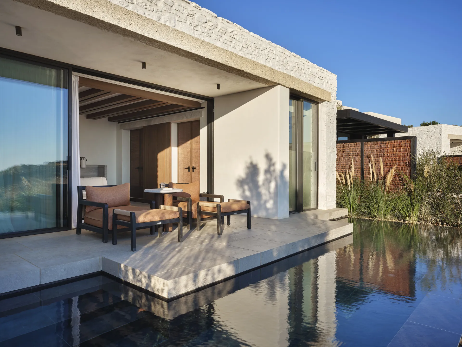 Of the 77 rooms and suites, 54 include private or shared pools. Terraces blur the line between indoors and out. The main infinity pool is etched into the landscape, appearing more like a natural formation than a design feature.