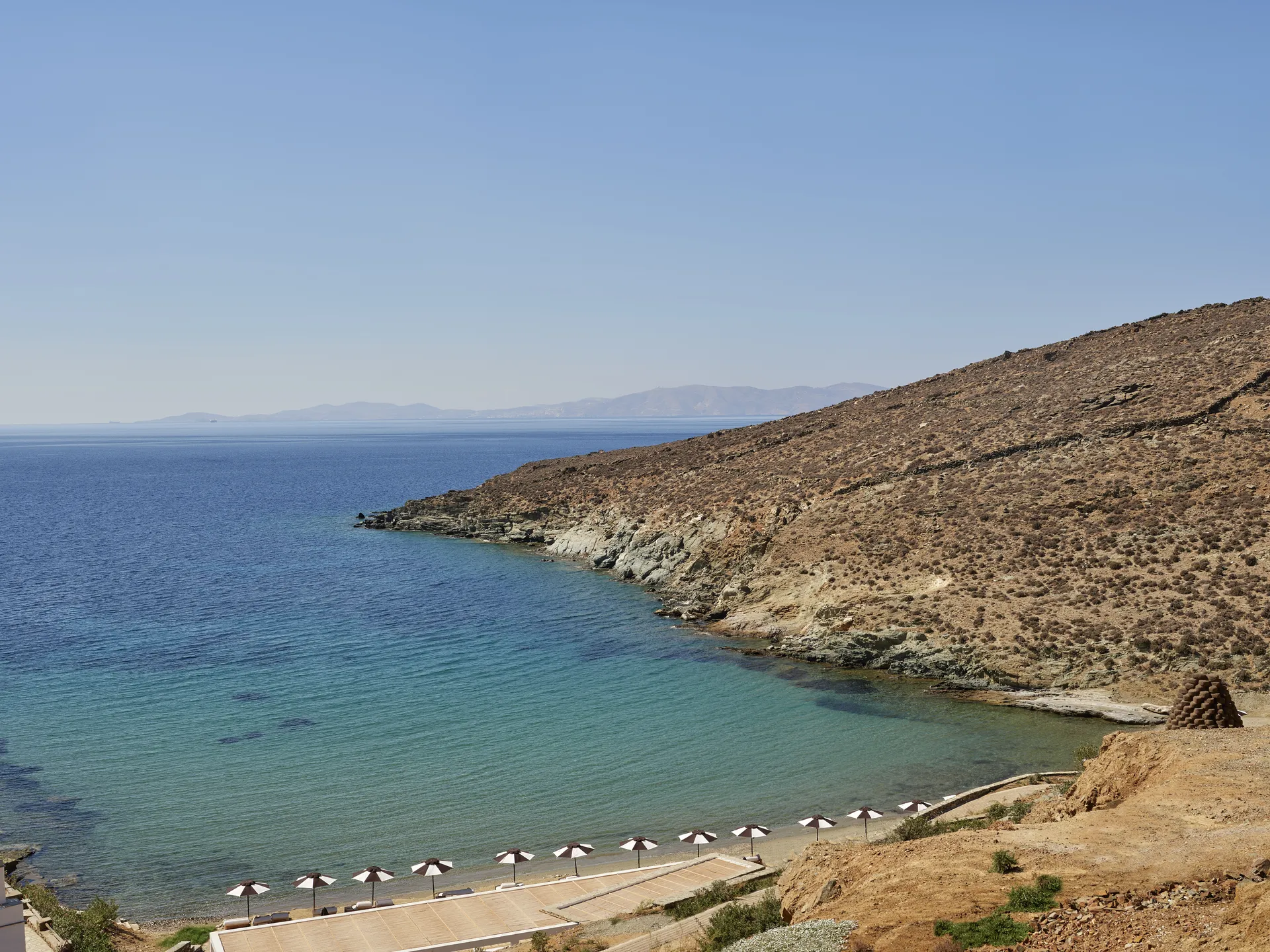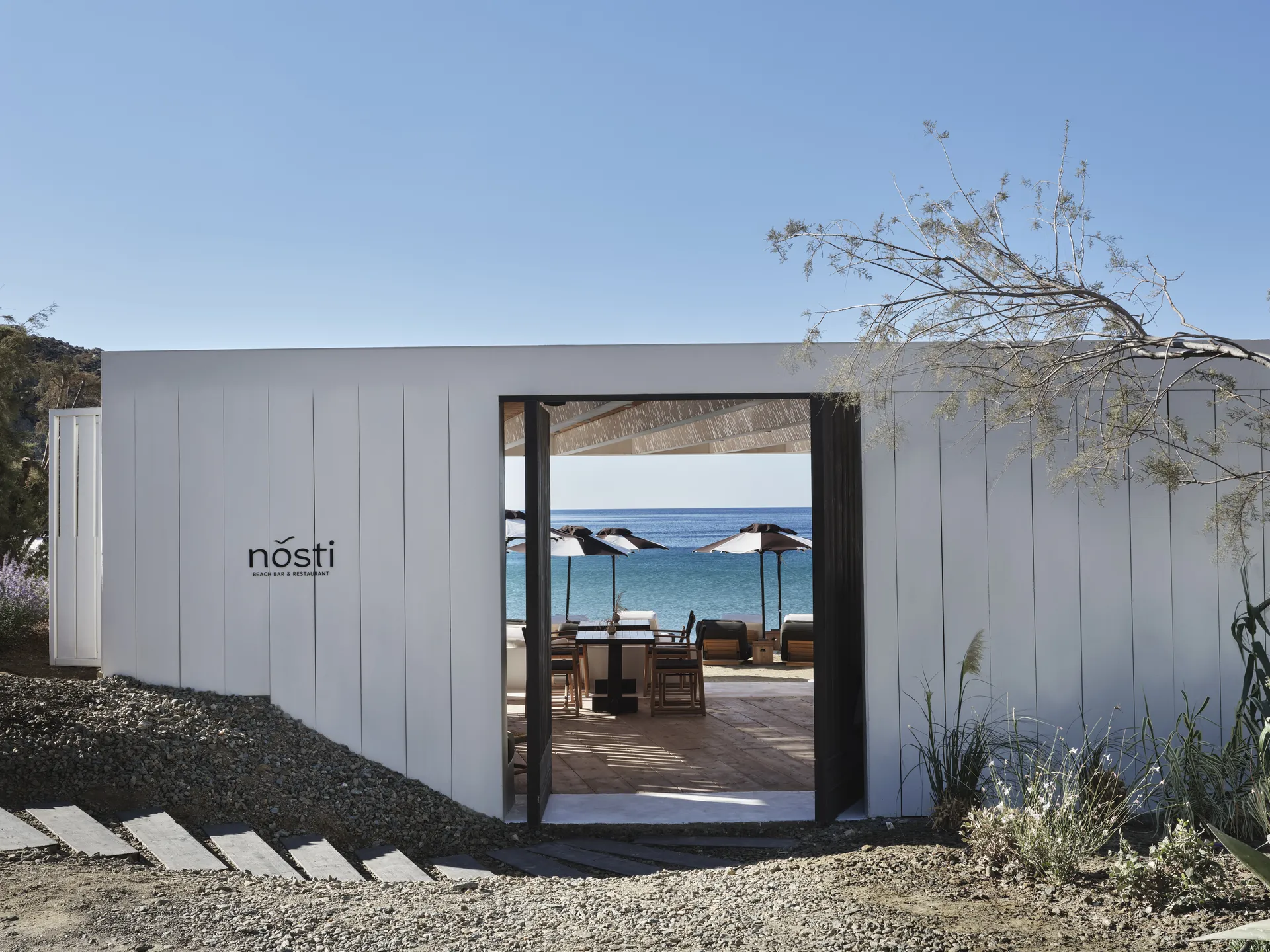 Dining happens across three venues: Eos offers a refined Greek-Med menu under the helm of chef Dimitris Skarmoutsos; Nǒsti beach bar keeps things casual and sun-soaked; and the poolside lounge serves local flavours with global precision. The on-site wellness center adds a full-service spa, indoor pool, and gym, but even that feels like a quiet continuation of the architecture, stone, water, light, and air.