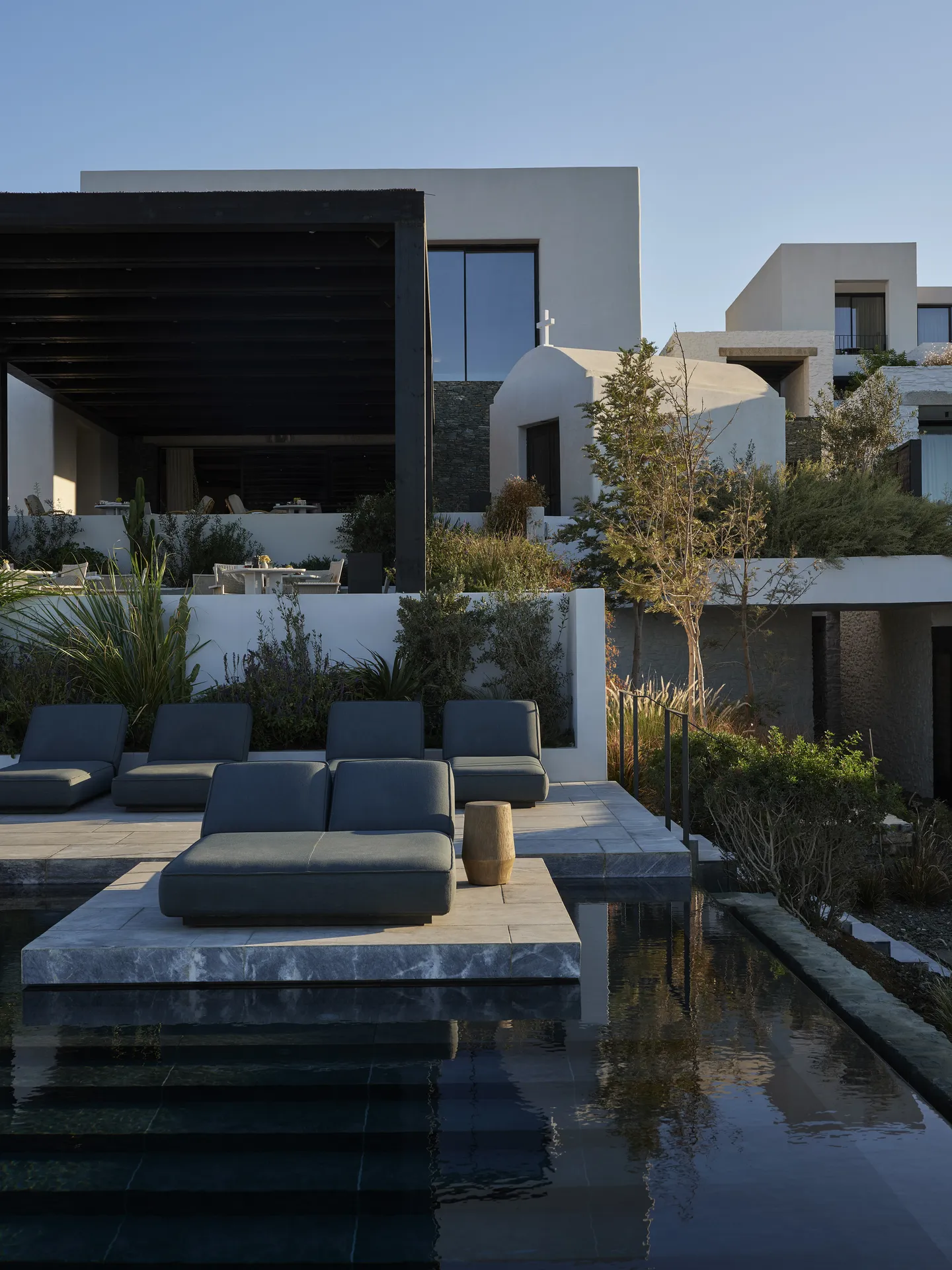 Designed by architect Panos Nikolaidis, with interiors by Studio Bonarchi, Odera’s built form echoes the island’s dovecotes, chapels, and fortified monasteries. Cubic volumes cluster organically, mimicking Tinian village formations. Narrow paths, layered courtyards, and water channels guide guests through a living sculpture, one that feels as though it’s always been here.