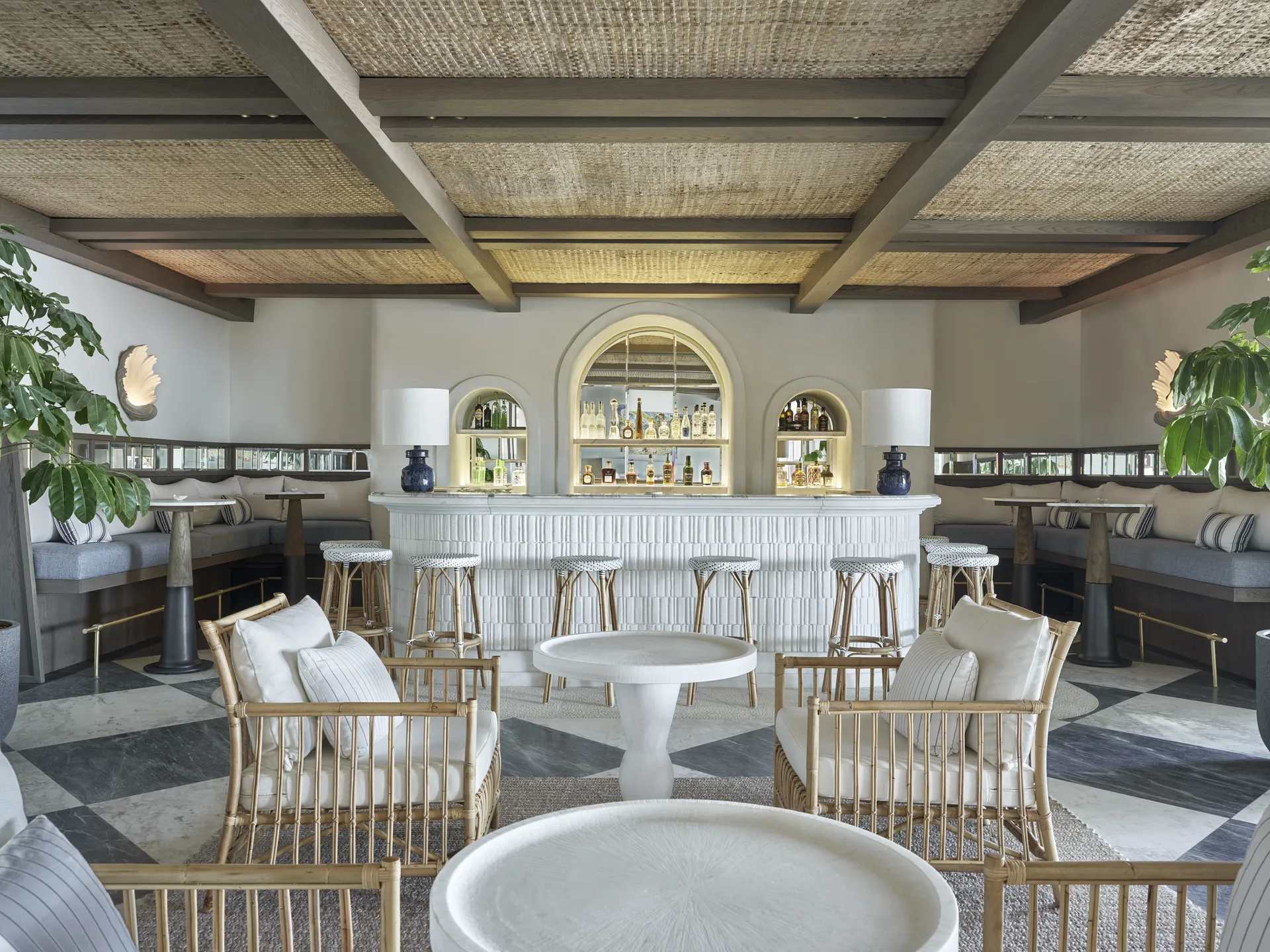 The material palette is local and timeless: whitewashed walls, reclaimed green and white marble, unpolished wood, raw concrete. In rooms, you’ll find hand-carved motifs referencing traditional stonework, bespoke furniture built with Tinian craft logic, and marble plate racks that recall domestic rituals from a slower era.